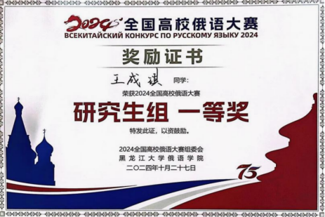 全国高校俄语大赛是俄语专业最高级别的国家赛事,是中俄“国家年”“语言年”活动教育领域五大机制化项目之一,至今已连续举办16届。本届大赛由教育部国际合作与交流司主办,黑龙江大学承办,来自全国165所高校的412名学生参加了此次比赛。初赛为线上进行,复赛和决赛为期两天,设有低年级组、高年级组和研究生组三个组别。研究生组组别中,组委会通过初赛选拔13名选手进入复赛;通过复赛选拔5位选手进入决赛;最终按照初赛、复赛和决赛在总成绩中的权重累计决出获奖选手,整个比赛赛程紧凑,极具难度。赛前学院高度重视此次比赛,精心做好选手选拔、培训和参赛的各项工作。辅导教师们对参赛选手进行了数月的集中培训。参赛时,王成琪同学在紧张激烈的氛围中始终沉着冷静、从容应对,表现出优秀的翻译表达水平、机敏的应变能力和稳定的心理素质,充分展现了我校青年学子的积极面貌。根据大赛奖励办法,王成琪同学将获得国家留学基金委全额资助赴俄攻读博士学位的资格。