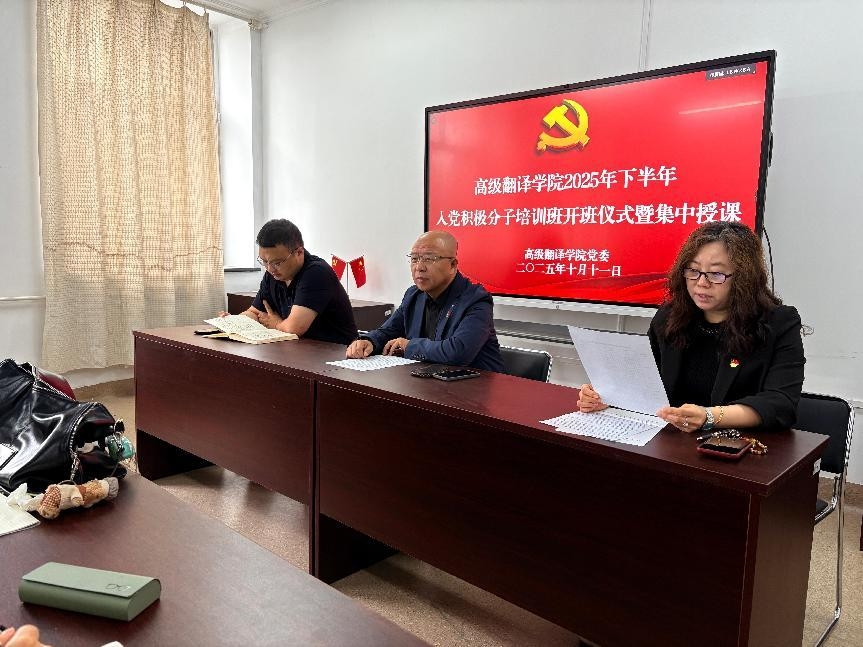 为加强对入党积极分子的培养教育,严格落实《中国共产党发展党员工作细则》和《黑龙江省普通高等学校发展党员工作规程(试行)》有关要求,按照《关于推进2025年发展党员工作重点任务的通知》,10月11日,高级翻译学院2025年下半年入党积极分子培训班开班仪式暨集中授课在主楼D321会议室召开。学院党委书记吴继锋、党委副书记周波、组织员仲维丹及全体学员参加会议,仲维丹主持会议。
