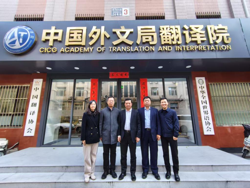 11月13日下午,高级翻译学院学术委员会主任严明、院长孙超赴中国外文局翻译院举行合作座谈。中国翻译协会副会长、中国外文局翻译院院长黄玉龙、副院长朱颖,中国外文局计划财务部产业与发行处处长佟萌,中国外文局翻译院相关部门负责同志参加座谈。会议由翻译院副院长朱颖主持。