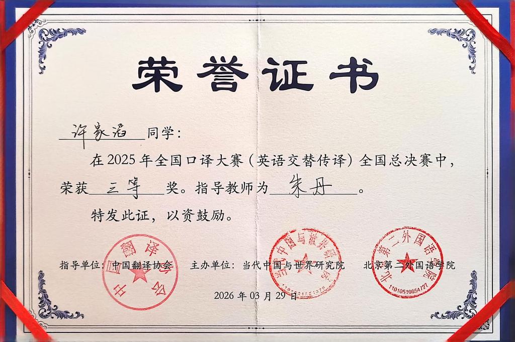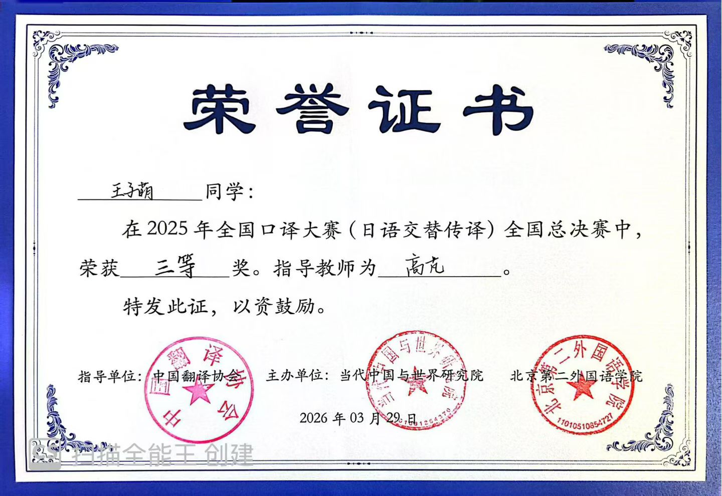 近日,第十四届全国口译大赛圆满落幕。我院学子凭借扎实的口译功底与出色的临场发挥,在决赛中斩获丰硕成果:2025级英语口译专业硕士许家滔(指导教师:朱丹)同学荣获英语交传决赛三等奖;2025级日语笔译专业硕士王子萌(指导教师:高芃、张立伟)同学荣获日语交传决赛三等奖。