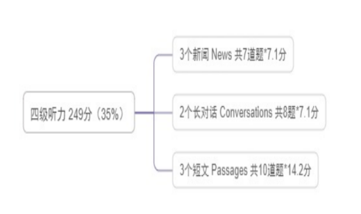 具体来说,四级听力部分包括新闻、长对话和短文三种题型,均为客观题,它们的分值分布如下: