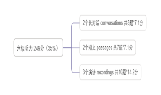 六级听力包括长对话、短文和演讲三种题型,均为客观题,它们的分值如下:
