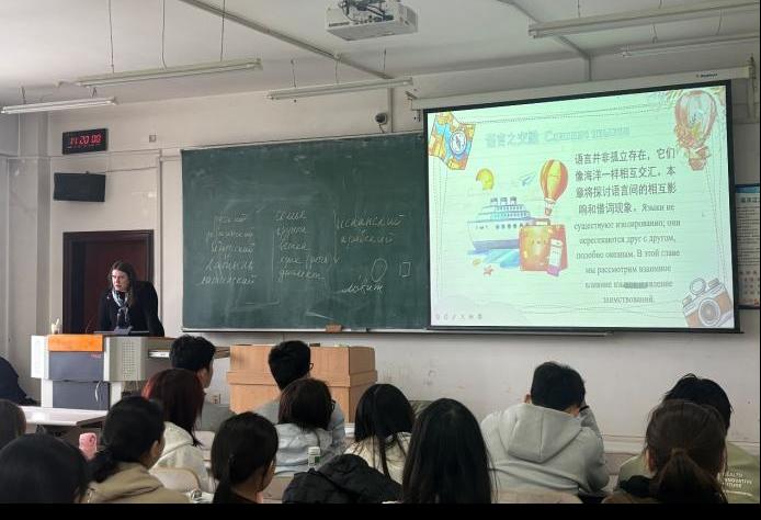 活动中,娜斯佳带领同学们走进“语言家族”。她借助世界语言分布地图和语言谱系树,讲解了世界九大语系的分布,重点解析俄语、英语所属的印欧语系。在“结构之比较”环节,她对比了俄、英、汉三种语言的书写系统与语法结构,拆解语言构建逻辑。