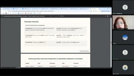 2月14日上午,伊尔库茨克国立大学副教授,继续教育与国际关系副主任,对外俄语教研室主任阿尔茨卡娅•尤莉娅•亚历山大罗芙娜受邀做了题为《俄英感知动词的功能与翻译问题的比较分析》的讲座。在讲座中,阿尔茨卡娅•尤莉娅•亚历山大罗芙娜为我们介绍了什么是感知动词。感知动词是人们从语言层面表达感知行为的典型手段,其交际目的旨在承担“吸引听者注意力、调节言语行为、表达对信息的理解与反馈”等语用功能。俄语和英语中有三种描述感官知觉语义的方式:作为活动的感知、惰性知觉和与观察者。